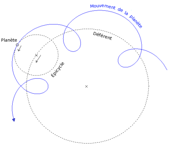 L’épicycle est un cercle sur lequel tourne une planète. Le centre de cet épicycle tourne lui aussi sur un cercle, le déférent. Vue du centre du cosmos (la Terre), la planète rebrousse réellement chemin mais seulement parce qu’on combine deux mouvements circulaires qui, chacun, restent directs. Les apparences sont sauvées…