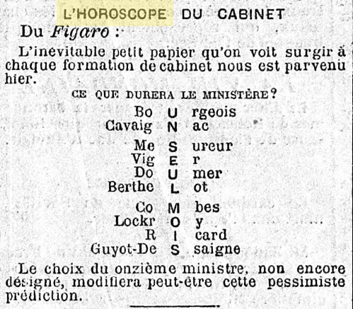 Mais continuons avec un autre curieux « horoscope », cette fois politique, présenté avec humour le 2 novembre 1895 (repris du Figaro). A noter que la question a dû être formulée après coup.