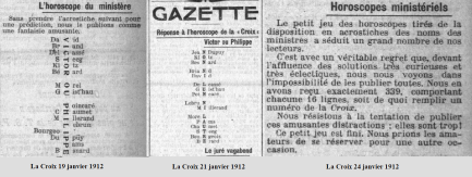 Cette pratique est non seulement populaire mais manifestement habituelle. L’astrologie y serait-elle donc aussi présente ? Les articles de fond traitant d’astrologie sont trop rares pour cela et, à l’inverse, quel est encore cet « horoscope » dans lequel, manifestement, il n’y a toujours pas d’astrologie ?! Une pratique si commune, en fait, qu’elle donne lieu en janvier 1912 à ce genre de publication dans la Croix, c’est-à-dire la presse catholique, et en première page !