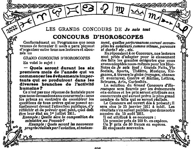Ces différentes significations du terme « horoscope » vont perdurer encore pendant des dizaines d’années, comme le montrent les exemples qui suivent maintenant. Le généraliste Je sais tout organisera par exemple, ni plus ni moins, qu’un « concours d’horoscopes » en décembre 1910 !