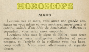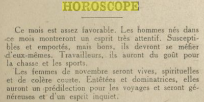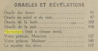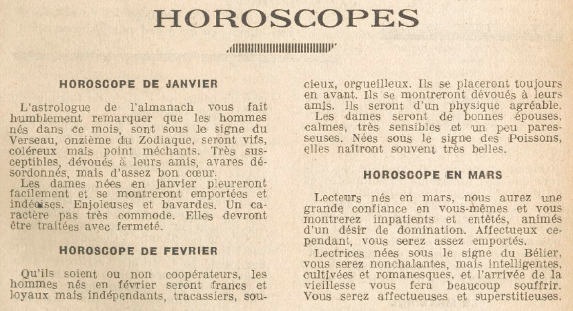 Mais continuons avec l’almanach des coopérateurs de 1928 qui annonce, dans la partie « Oracles et révélations », un horoscope pour chacun des mois de l’année.