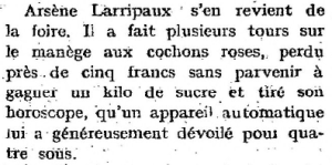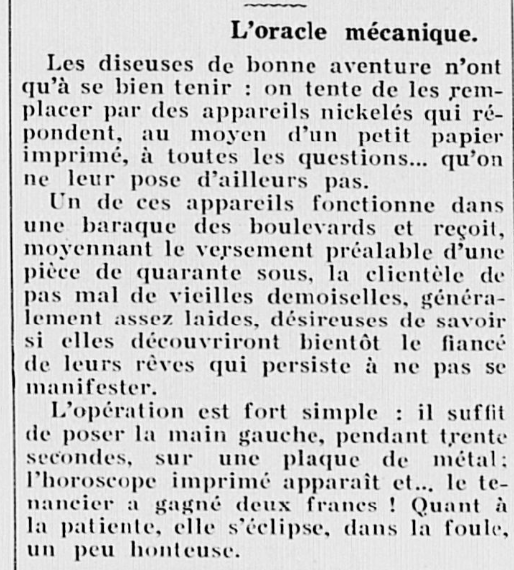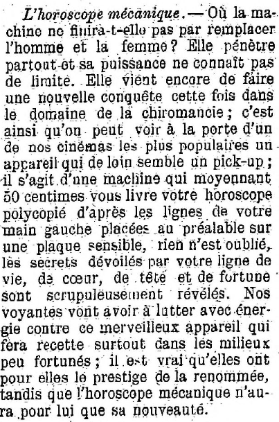 Mais voici un autre exemple, plus déroutant encore, celui des « horoscopes mécaniques » ! En 1934, soit bien avant Astroflash et ses portraits astrologiques établis par ordinateur (qui feront beaucoup parler dans les années 60), ils sont proposés à la sortie d’une salle de cinéma. Afin que soit imprimé cet horoscope, il suffisait au préalable de prendre… la photo des lignes de la main ! Cette nouvelle est annoncée dans la Gazette du Nord de Madagascar du 8 septembre 1934 mais aussi comme « oracle mécanique » dans l’Afrique du Nord Illustré du 10 janvier 1931. Moins étonnant : la présence de ces « horoscopes mécaniques » est évoquée en fête foraine dans une nouvelle issue du petit journal Le Pêle-Mêle du 5 juillet 1925.
