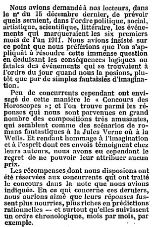 Dans celui-ci, le but est de tenter de prévoir les événements des mois prochains jusqu’en août 1911. Le concours est ouvert à tous et il faut signaler qu’aucun astrologue et autre voyant ne va manifestement y participer. Il n’y aura, d’ailleurs, aucun gagnant d’après les résultats donnés le 15 août 1911. Encore une fois, pas d’astrologie dans la description alors que les cases des signes astrologiques figurent en enseigne de la publication…