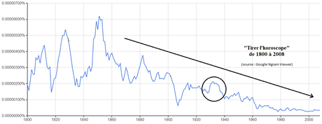 Nous allons terminer avec l’usage de l’expression « tirer l’horoscope » et du terme « horoscope » depuis les années 1800. Une recherche sur Google Ngram Viewer (présentation et limites) montre que l’expression « tirer l’horoscope » a connu sa plus grande popularité sur la première moitié du XIXe siècle avant de décroitre inexorablement jusqu’à nos jours. On remarque une petite recrudescence dans les années 30 au moment où on commence à parler de ces astrologues qui « tirent l’horoscope » pour les journaux.