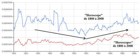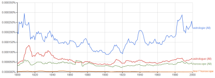 Pour mettre ces courbes en perspective, Ngram nous permet de comparer les proportions d’occurrences des termes astrologie, astrologue, horoscope, ainsi que de l’expression tirer l’horoscope.