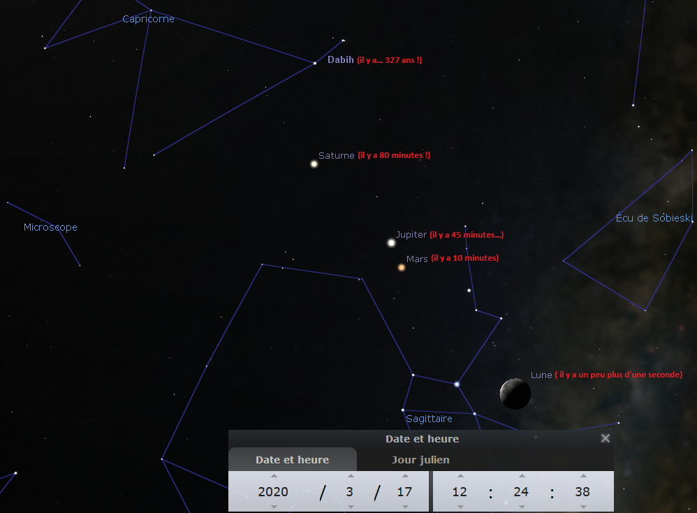 …vous voyez La Lune telle qu’elle était il y a un peu plus d’une seconde et les planètes telles qu’elles étaient par exemple, il y a 10 minutes pour Mars, 45 minutes pour Jupiter et 80 minutes pour Saturne !
