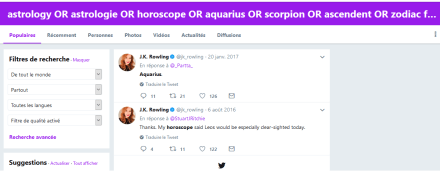 A ce propos, une des personnes présentes dans le public m’a demandé fin 2017 si j’avais interpelé directement J.K. Rowling via Twitter, là où elle est très active. Je l’ai fait ! J’avais déjà vérifié que J.K. Rowling s’était très peu exprimée sur l’astrologie sur cette plateforme, malgré les demandes des fans.