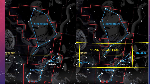 1 les constellations du zodiaque (astronomique) ne sont pas toutes prises dans la bande du zodiaque (des signes astrologiques) : le Scorpion, par exemple, en déborde très largement, d’où la question du Serpentaire.