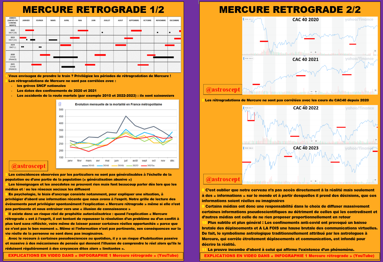 Cette infographie est faite pour ceux qui veulent argumenter avec des astrologisants sur ce point précis (blocages des déplacements et de la communication, risques de pertes d’argent et d’accidents) ou à propos des notions d’illusion de connaissance et de croyances limitantes ou d’inversion de la charge de la preuve. Pour cela, j’ai confronté les périodes de rétrogradation de Mercure aux périodes de grèves SNCF nationales, confinements contre la covid, cours du CAC40 et accidentalité routière mortelle.