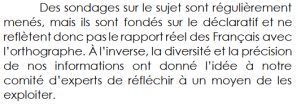Le Projet Voltaire (lien) vend des remises à niveau en orthographe (5 millions d’utilisateurs revendiqués), activité salutaire et récompensée plusieurs fois. Mais le Projet Voltaire publie aussi un baromètre annuel dans lequel on trouve parfois des choses pour le moins très discutables. Le dernier en date a été rendu public le 4 décembre 2019, son ambition est de mesurer « le rapport réel des Français avec l’orthographe ».