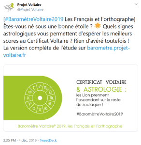 Dans la première partie de ce dossier, nous nous sommes attachés à définir les limites a priori de nos conclusions et remettre en contexte la réception du Baromètre Voltaire® 2019 (lien vers le fichier pdf). Nous avons aussi soulevé quelques questions posées par les ambitions qui sont les siennes depuis sa création, à savoir renseigner sur « le lien réel des Français à l’orthographe », notamment sa représentativité. Nous avons discuté ensuite les surprenants graphiques proposés pour représenter ses résultats statistiques. Nous avons terminé sur un étrange appel à la popularité des signes astrologiques comme semblant de justification de l’intérêt du résultat proposé par le Baromètre.